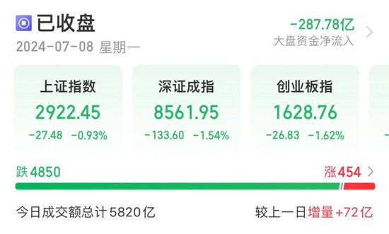 7月8日,A股三大指数低开低走,沪指跌0.93%,深成指跌1.54%,创业板指跌1.62%,北证50指数跌3.6%,沪深京三市成交额逾5840亿元。两市超4800只个股下跌。