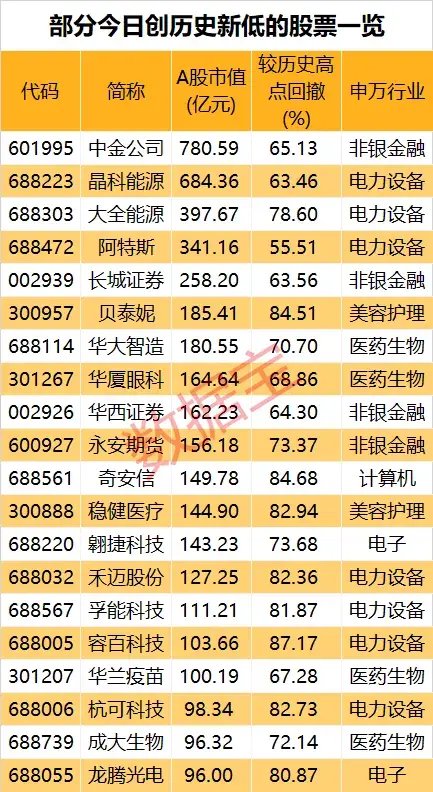 据数据宝统计,不含今年上市的次新股,以今日盘中最低价计算,超180股创下历史新低,其中不乏行业的龙头股,如中金公司、晶科能源、贝泰妮、华厦眼科、永安期货等。