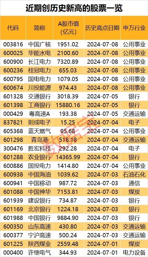 近期,A股市场呈现两极分化走势,题材股炒作偃旗息鼓,高股息板块持续走强。7月8日,公用事业、银行板块逆势飘红,中国广核、华能水电、桂冠电力、川投能源、国电电力、长江电力6股盘中股价创历史新高,呈现慢牛股走势。