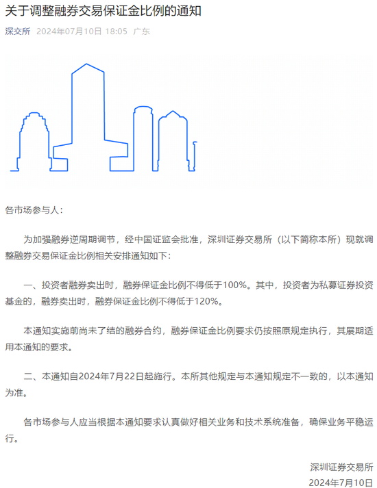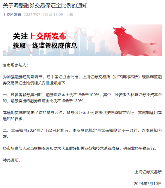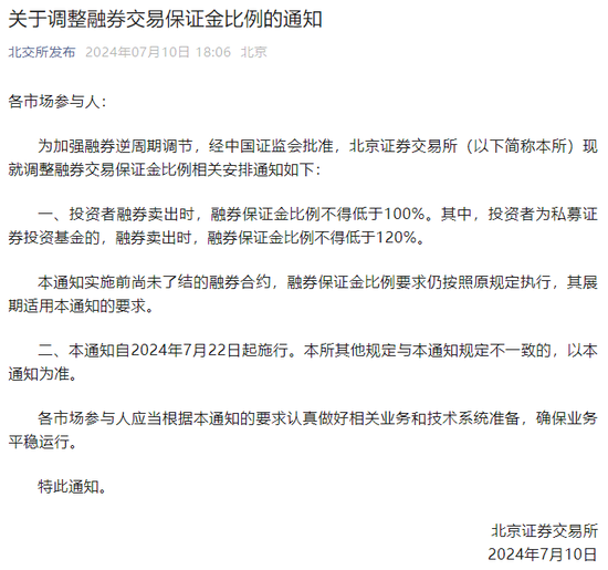 7月10日当日,沪深北三大交易所分别发布《关于调整融券交易保证金比例的通知》,集体宣布将调整融券交易保证金比例,相关安排通知如下: