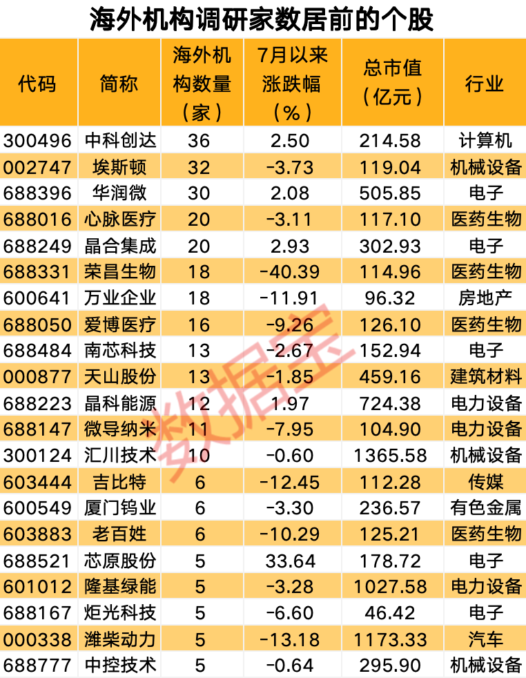 据证券时报?数据宝统计,近10日海外机构对99家上市公司进行调研,其中,中科创达最受关注,获36家海外机构密集调研,其他还有埃斯顿、华润微、晶合集成、心脉医疗获20家及以上海外机构调研。
