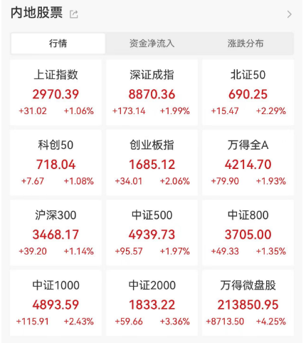 三大指数今日高开高走,截至收盘沪指涨1.06%,深成指涨1.99%,创业板指涨2.06%,微盘股指数大涨4%。