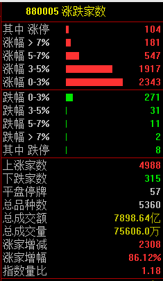 市场上演普涨行情,4988个股上涨,104只个股涨停,315只个股下跌。市场成交明显放量,成交额近7900亿元。
