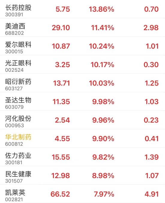 医药生物板块盘中发力走高,创新药方向领涨。截至收盘,长药控股、美迪西、爱尔眼科涨超10%,光正眼科、昭衍新药、圣达生物、河化股份涨停。