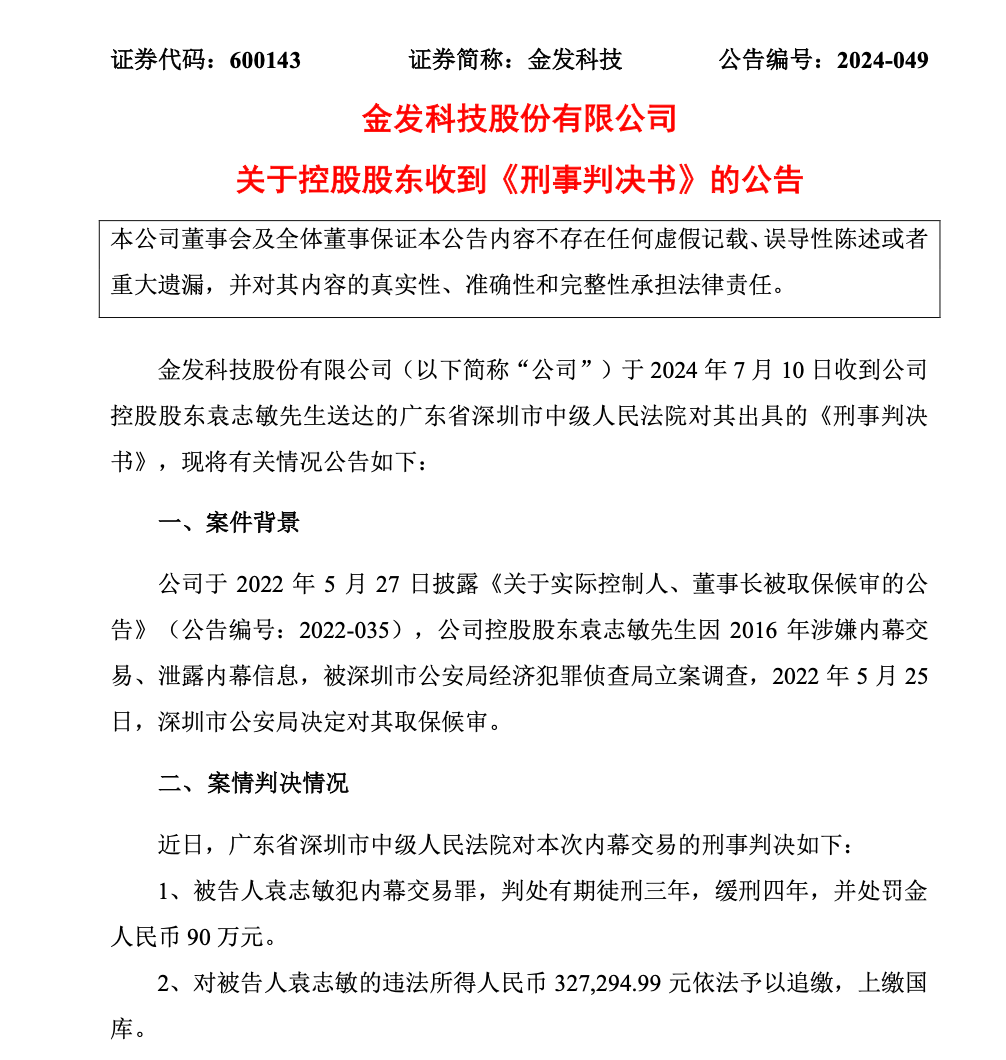 7月10日,金发科技收到袁志敏送达的广东省深圳市中级人民法院对其出具的《刑事判决书》。