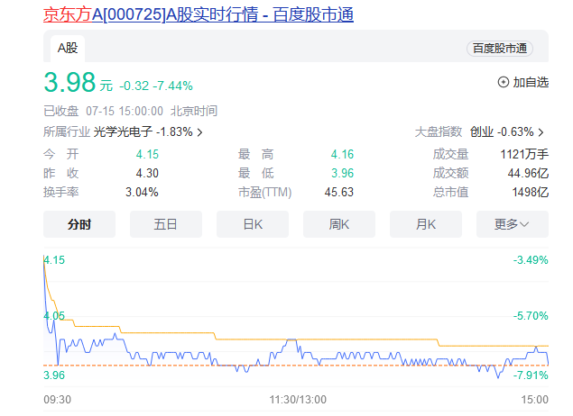 京东方A盘中大幅下探,一度跌近8%,截至收盘,该股跌7.44%报3.98元,最新市值约1500亿元。