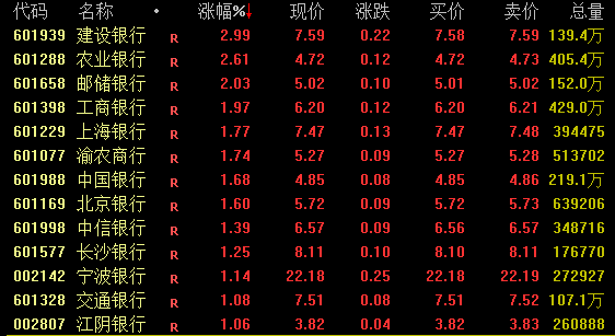 银行板块今日再度走强,截至收盘,建设银行涨约3%,农业银行、邮储银行涨逾2%,工商银行、中国银行、交通银行等均上扬。值得注意的是,建设银行、中国银行、工商银行、农业银行盘中均创出历史新高。