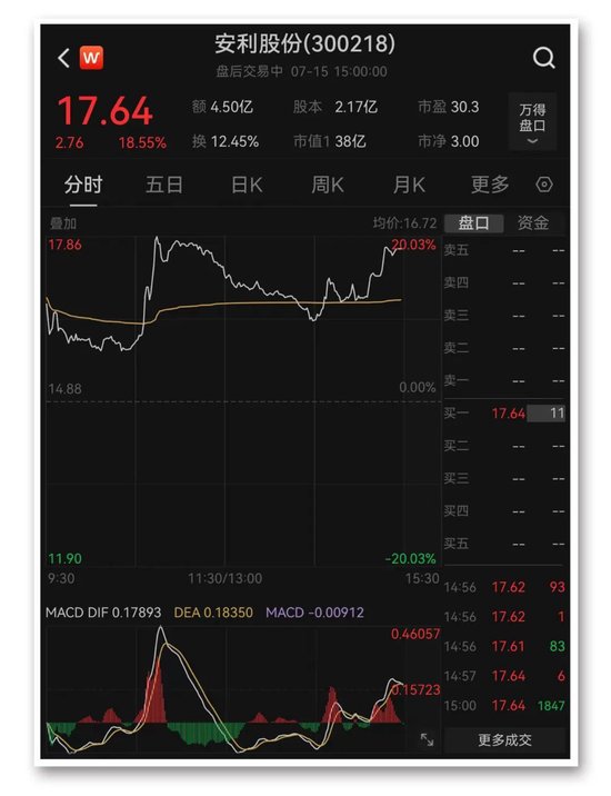 7月14日晚间,又有74家公司披露中报业绩预告,业绩预增或扭亏的公司为68家,预喜比例达92%。其中,安利股份预计上半年净利同比增长9348.14%-10421.8%。截至今日收盘,安利股份大涨18.55%。