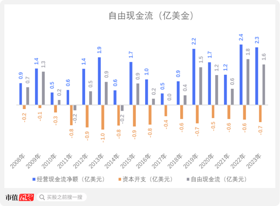 因为公司一直以来都对快速的规模化扩张和业务多元化保持谨慎,对于资本开支的花费在过去10年基本维持在0.5-0.8亿之间,很少激进地增加投入,几乎每年一半以上的经营现金流净额都能转化为公司的自由现金流。