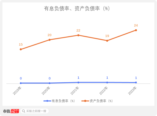 截至2023年末,公司的有息负债率和资产负债率分别为0.5%和24%。