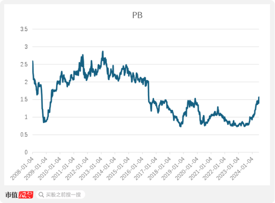 随着估值提升,公司PB相比一年前已有了明显提高:2024年6月的PB大约为1.4,去年同期还只是0.8。