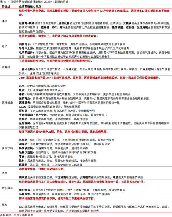 我们在文末汇总了中信证券研究部行业组对于中报业绩的前瞻,部分观点如下:
