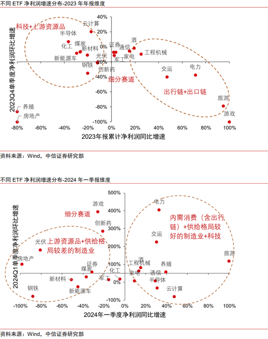 4)预计内需消费、供需格局较好的制造业、科技、医药会成为未来的亮点。大类行业层面,2023年以来业绩持续兑现的出行链和出口链仍是为数不多的高景气品种,其中出口链已经开始扩散到消费整体,纯内需消费品种2024年一季报开始触底反弹;出口链内部已经开始出现分化,供需格局相对稳定的品种盈利同环比增速较好,但供需格局相对恶化的品类同比增速开始承压;上游资源品分化十分显著,有色价格和盈利明显优于黑色系;科技板块自2023年中报开始出现业绩拐点,电子行业自2024年一季报开始连续两个季度成为盈利亮点。