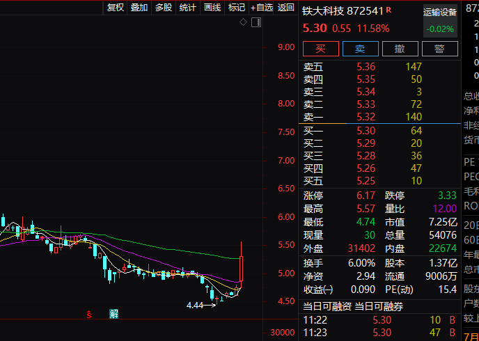 铁大科技今天上午盘中一度大涨逾17%。