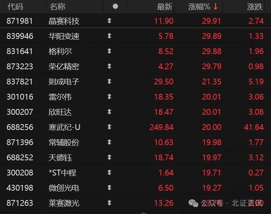 至收盘北证个股普遍上涨,仅4只个股下跌。其中,格利尔高开高走早盘即封于30cm涨停板,荣亿精密在格利尔之后也快速拉升封涨停,午后晶赛科技接棒拉升涨停,华阳变速至收盘同样封于涨停板。