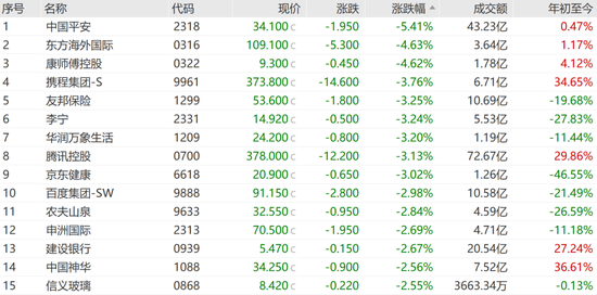金融股跌幅居前,除中国平安外,友邦保险跌3.25%,建设银行跌2.67%。