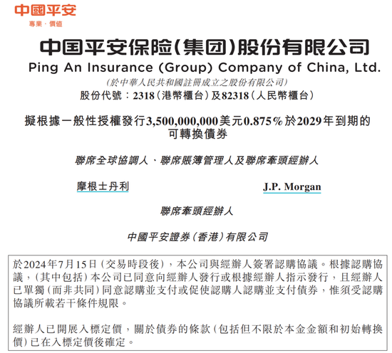 7月16日,中国平安发布公告称,拟发行35亿美元于2029年到期的可转换债券,年利率为0.875%。