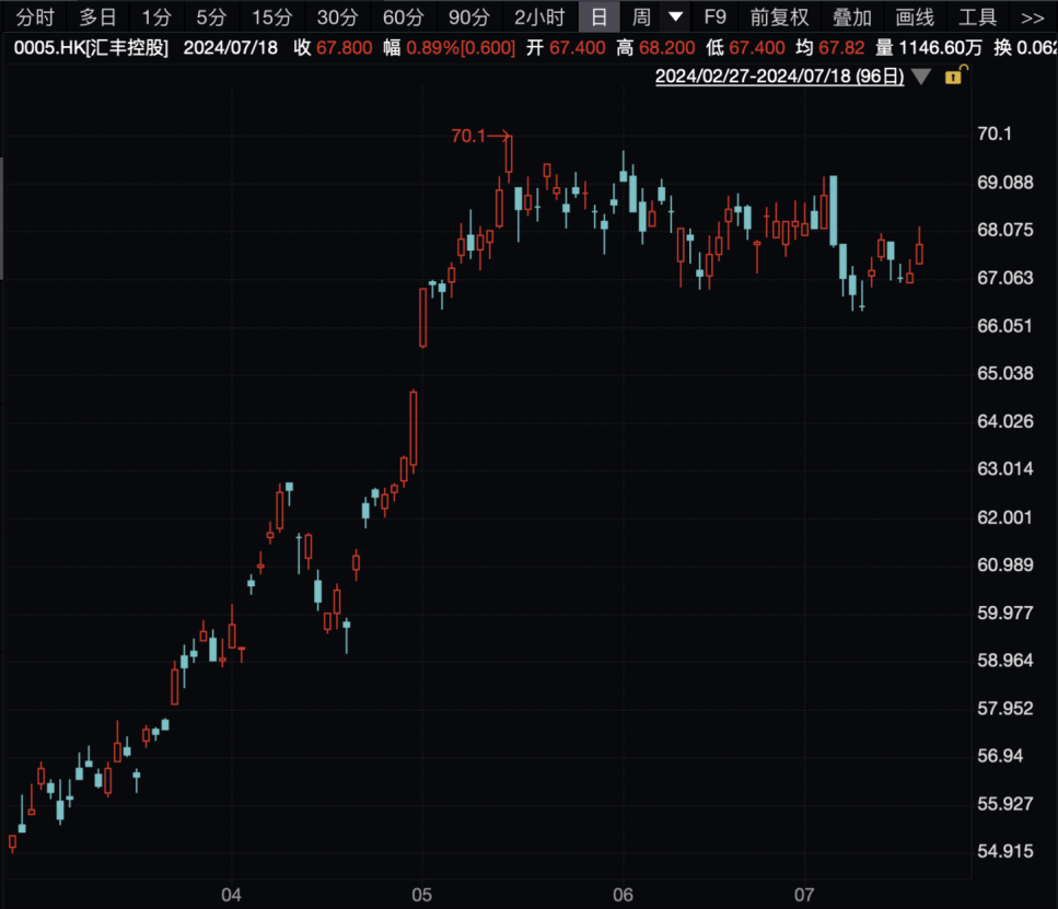 7月18日,汇丰控股涨0.89%。2024年1月1日至7月18日,汇丰控股股价累计上涨16.11%。