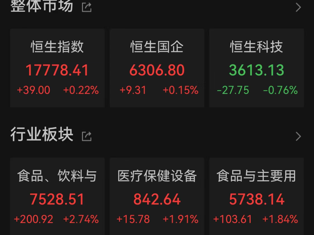 个股方面,消费蓝筹农夫山泉涨6.48%;能源股涨幅居前,中海油田服务涨1.89%,中国石油化工股份涨1.87%、中国海洋石油涨1.89%;科技股下挫,小鹏汽车-W跌5.20%。