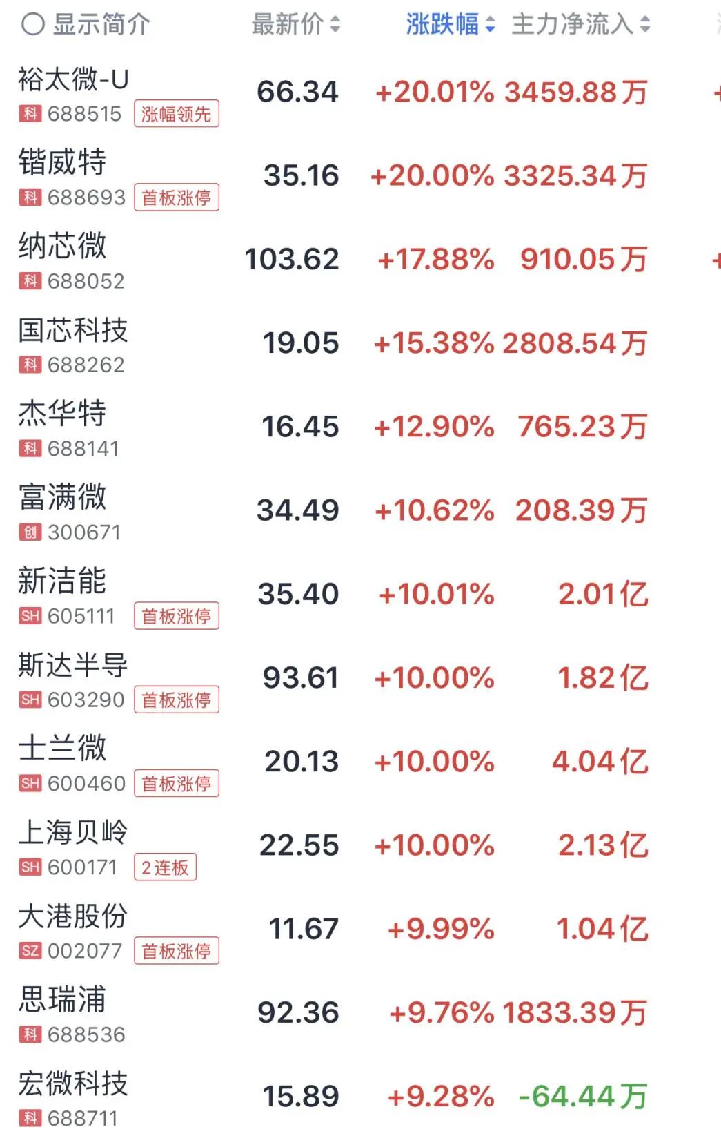 裕太微-U、锴威特盘中“20cm”涨停,新洁能斯达半导上海贝岭等亦涨停,纳芯微盘中一度大涨逾19%,另有多股盘中涨幅超过10%。