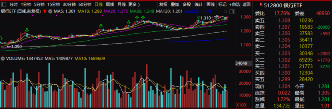 今天,整个银行板块表现十分强劲,银行ETF涨幅都达到了1.7%以上。这与昨天的市场形成了鲜明对比。