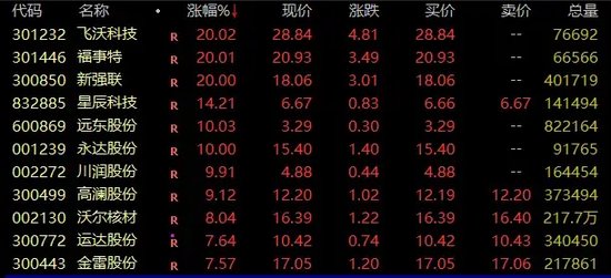 风电概念盘中发力走高,截至收盘,飞沃科技、福事特、新强联等“20cm”涨停,星辰科技涨超14%,远东股份、永达股份亦涨停。