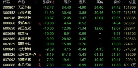 无人驾驶概念亦下挫,天迈科技跌超12%,万集科技、雄帝科技跌超10%,锦江在线、金溢科技等跌停。