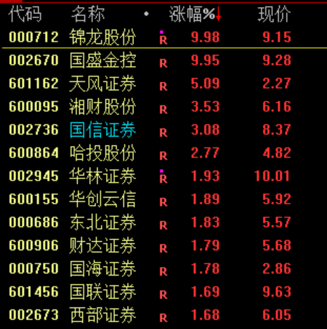 证券板块震荡上行,国盛金控锦龙股份冲击涨停,天风证券首创证券、湘财证券、华林证券国信证券等涨逾2%。