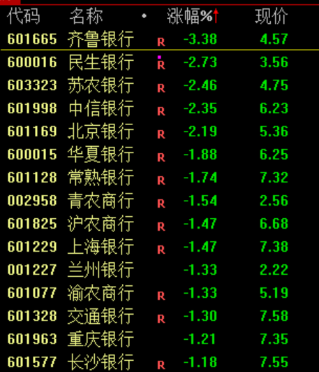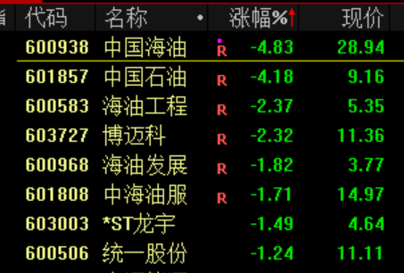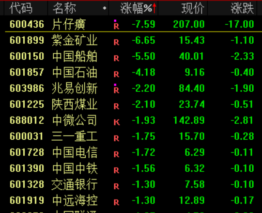 跌幅方面,银行、上证50权重等集体补跌,片仔癀跌超7%,紫金矿业跌超6%,中国石油跌超4%,交通银行农业银行等银行股小幅回调。