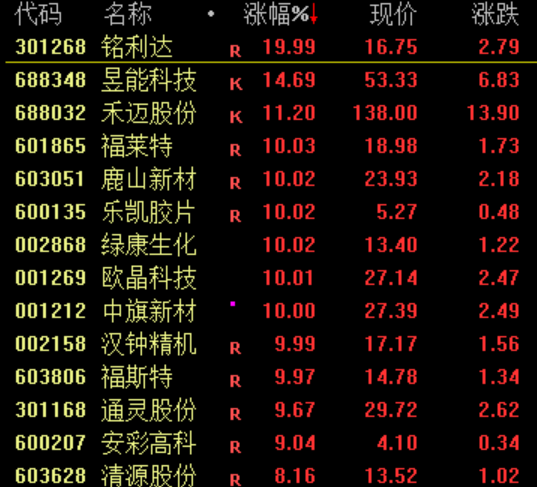 光伏、风电等新能源赛道逆势反弹,铭利达双一科技福莱特鹿山新材绿康生化中旗新材福斯特等十余股集体封板。