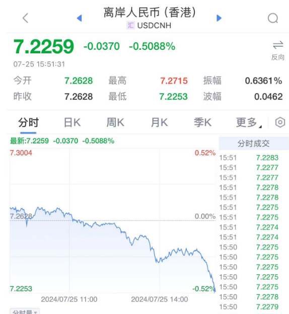 7月25日,在岸人民币汇率日内上涨近200点,最高触及7.2432。离岸人民币汇率快速拉升,升破7.23关口,日内涨近400个基点。
