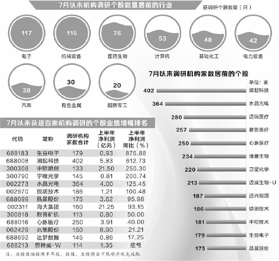 据证券时报·数据宝统计,7月以来有748只个股获得机构调研。分行业来看,机构调研股主要集中在电子、机械设备、医药生物、计算机等行业,其中电子和机械设备行业机构调研个股数量居前,分别达117只和115只。