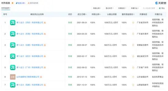据了解,萝卜快跑已经于北京、武汉、重庆、深圳、上海、广州等11个城市开放载人测试运营服务。天眼查显示,“萝卜快跑”关联公司萝卜运力(北京)科技有限公司直接持股7家企业,其中6家分别为在深圳、武汉、合肥、广州、东莞、阳泉的科技公司,显示其业务布局已拓展至多座城市。