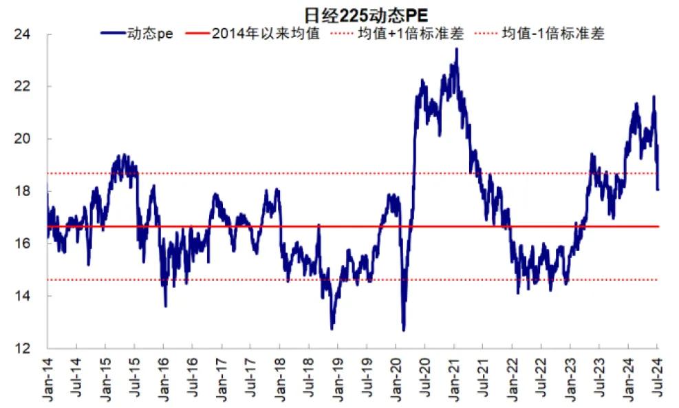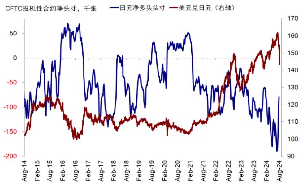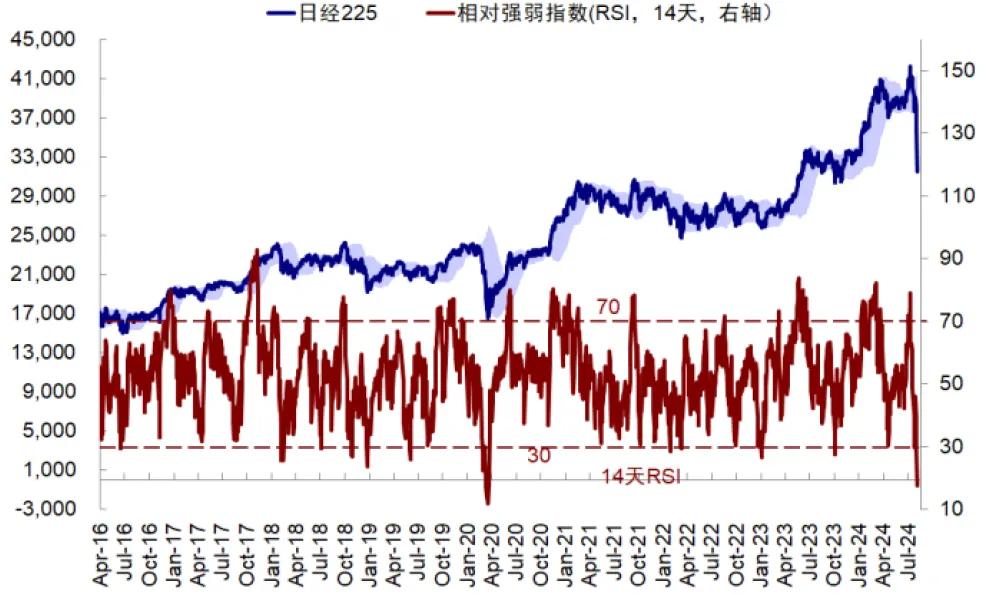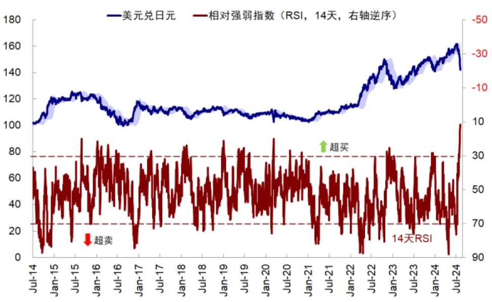 从技术面指标看,日股已经严重超卖,日经指数RSI已经达到17.7,是2020年疫情以来的新低。日元的超买程度也创了新高。日元CFTC投机性仓位依然处于空头居多的状态,但净空头7月23日至30日单周下滑29.1%,空头快速回补。日股估值快速回到了18倍附近,略高于2014年以来均值水平。美股VIX指数42.7%,也为疫情以来的新高。所以我们综合这些指标来看,市场情绪已经得到了较大程度的宣泄。