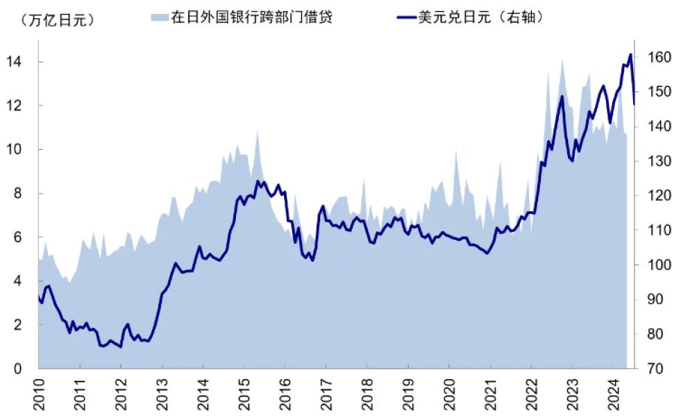 首先,显性的套息交易规模很难准确获得(以在日本的外国银行分部跨部门借贷规模来看,截至5月数据大致为10.7万亿日元左右;以BIS统计的从日本借出以日元计价的跨境债务规模衡量,大致为1万亿美元左右),更何况还有其他非显性渠道。其次,即便我们以上面的规模做一个参照,也难以完全假设套息交易逆转到什么程度才算出清,毕竟这与投资者情绪以及交易的连锁反应有很大关系。假设我们以在日本的外国银行分部跨部门借贷规模近似的作为套息交易规模的观察窗口(必然还存在其他渠道和途径),截至5月存量规模为10.7万亿日元,假设回到2022年初6.1万亿日元的低点,需要回落的规模为4.5万亿日元,这个与周一日经指数一天的成交5.1万亿日元基本相当。但这一数据的缺陷也很明显,统计不全且时间滞后。