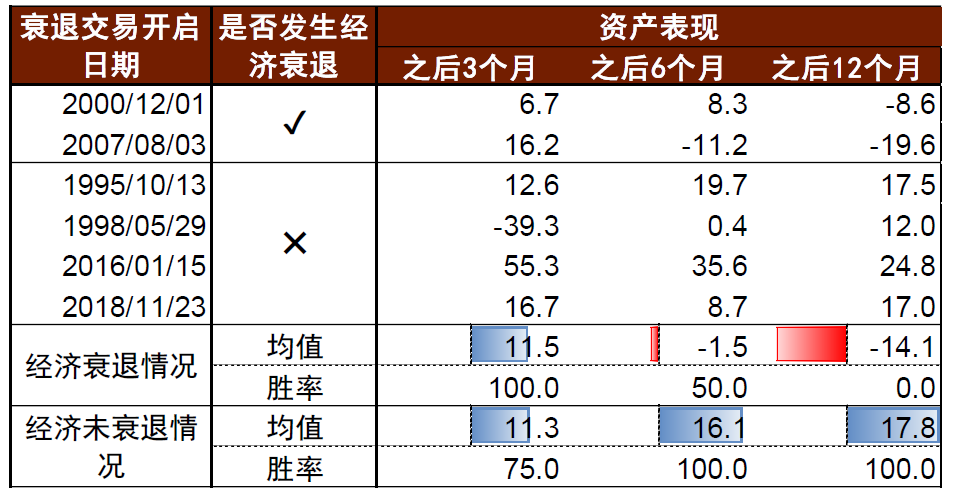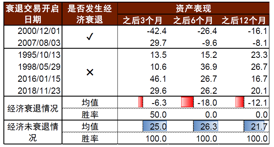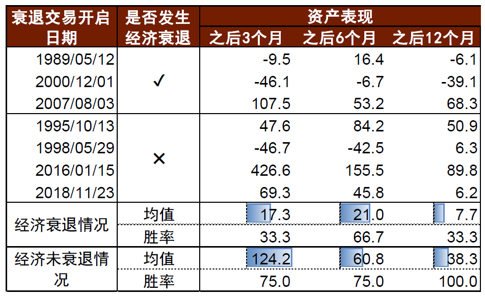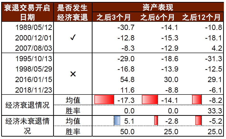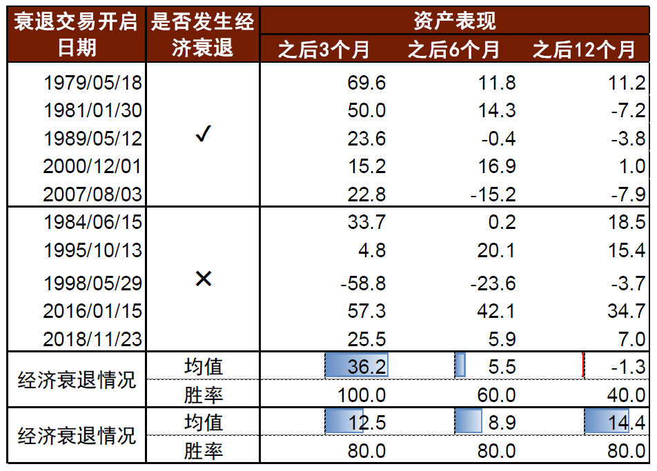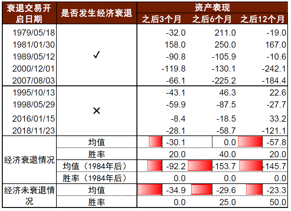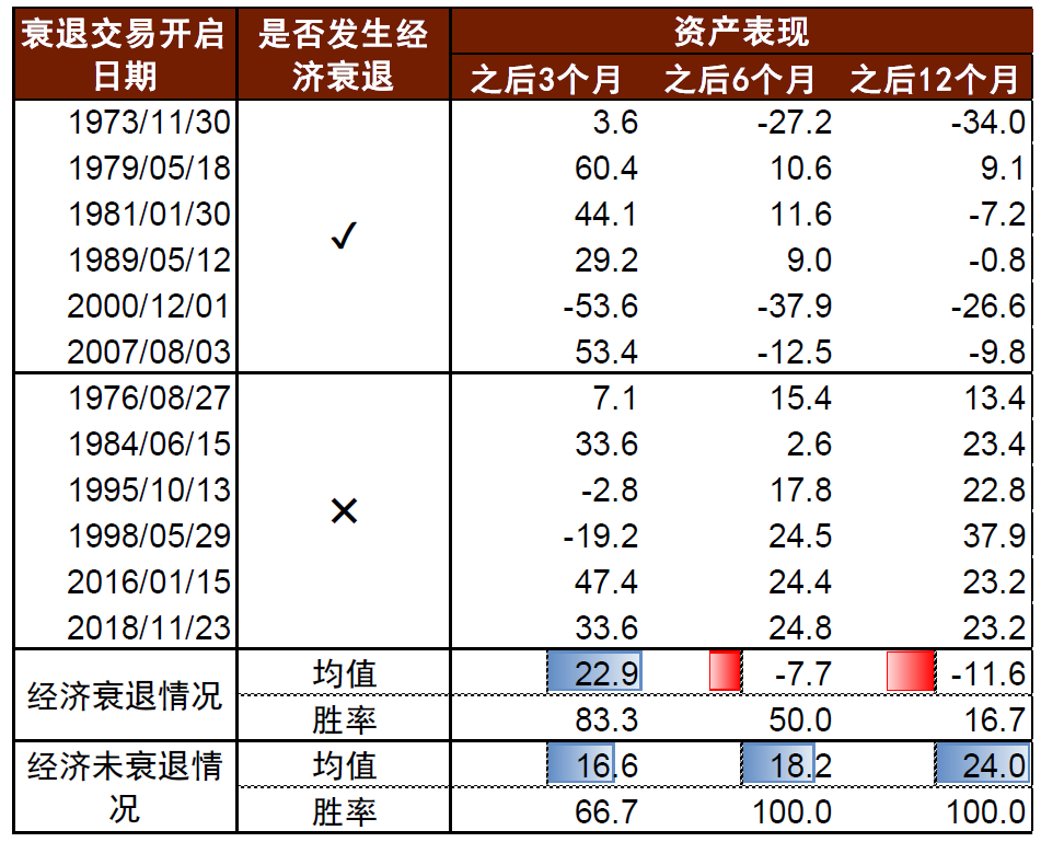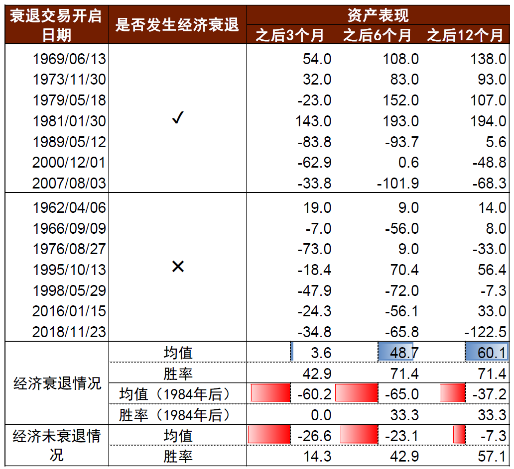 在经济衰退的预期下,市场认为企业盈利可能下滑,雇佣收紧,失业率上升,投资者则远离股市而转入避险的国债,表现为股跌债涨的特征。基于此,我们在历史上失业率从低位开始上行阶段中,寻找金融市场连续两周及以上出现股跌债涨的时段,作为衰退交易的开启时间。按此规则,从1960年代以来,我们发现了15次类似的衰退交易开启,其中7次真的发生了经济衰退,而8次并未衰退。以这十五次衰退交易开启的时间为基准,我们对比之后3、6、12个月各类资产的表现[1]。总结来看,当衰退交易开启后,后市的表现将更多取决于经济衰退能否真正兑现。