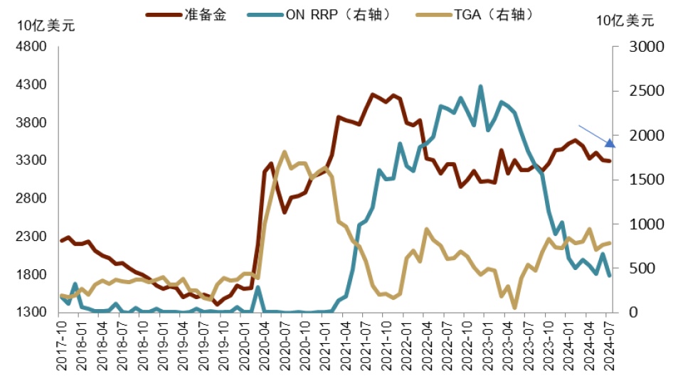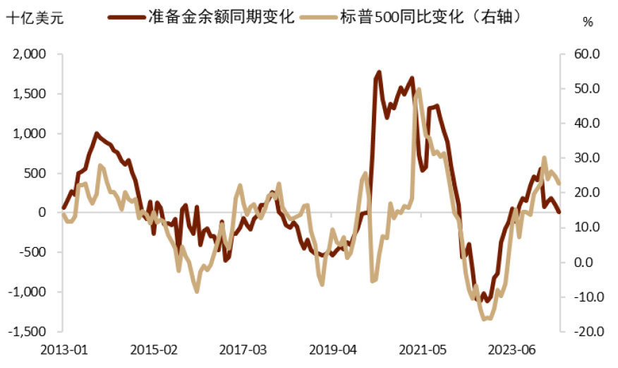 往前看,如果降息兑现,实质降低短期融资成本,我们预计经济仍有较大的可能“软着陆”并实现经济周期的重启。7月中旬以来“衰退交易”很难得到经济基本面的支撑,市场更有可能朝着历史上衰退交易被证伪的情况发展。但我们同时提醒,近期扰动全球市场的外生事件频发,日元套利交易平仓、地缘政治风险、美国大选等事件叠加在一起,不确定性加剧。再加上持续缩表导致美元狭义流动性下滑(图表24),对股市起到压制作用(图表25),市场容易出现“惊弓之鸟”的反应。
