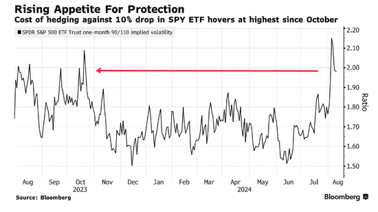 彭博汇编的数据显示,追踪大盘指数的最大交易所交易基金(ETF)——SPDR S&P 500 ETF信托(SPDR S&P 500 ETF Trust,简称SPY)防范未来30天下跌10%的合约价格约为去年10月以来的最高水平,是防范上涨10%的合约价格的两倍。