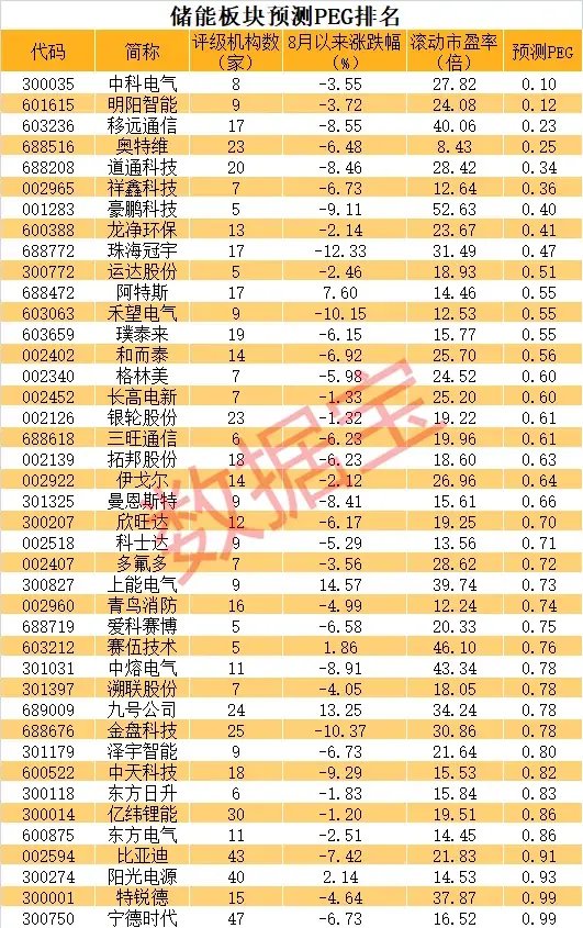 储能板块作为成长股,用PEG可以一定程度看出个股的低估程度。数据宝用最新市盈率和公司今年、明年及2026年机构一致预测净利增速平均值相比,发现有41只评级机构数在5家以上且公司回购的个股或处于价值低估的状态。其中,中科电气机构一致预测今后三年净利增速分别为707.76%、52.08%和35.49%,其最新滚动市盈率为27.82倍,则预测PEG为0.1。此外,明阳智能、移远通信、奥特维等个股预测PEG均低于0.3。