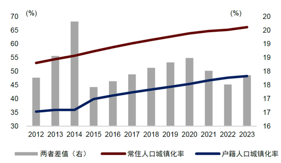 但缩小常住和户籍人口“两类城镇化率”难度可能相对较大。户籍与常住人口城镇化率的差距仍有17.9ppt,2012年以来二者的差距有所扩大。对两类城镇化率差距的目标表述,从《“十四五”新型城镇化实施方案》的“明显缩小”到《行动计划》的“努力缩小”,目标也更为务实。2021年“十四五”规划提出的“以经常居住地登记户口制度”已试行多年,公安部[25]解读其意味着“对于城区常住人口300万以下的城市,就业或居住年限原则上为半年,同时不得附加购买房屋、投资纳税等额外限制条件”,但户籍城镇化率并未显著加快。这或许是因为一次性大规模新市民落户对于流入地公共资源的冲击和财政的压力较大,同时特大超大城市受规模承载限制仍有落户门槛。