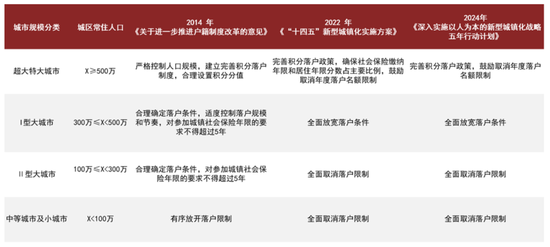? 2019年《新型城镇化建设重点任务》进一步放开落户限制,全面取消300万人口以下城市的落户限制,全面放宽人口300万-500万的I型大城市(13个,2022年统计口径[6])的落户条件,超大(10个,人口1000万+)特大(9个,人口500万-1000万)完善积分落户、鼓励取消年度落户名额。至此,300万人口以下城市实现零门槛落户。