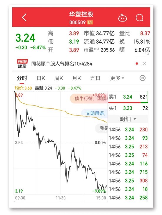 华塑控股尾盘触及跌停,上演“天地板”,该股早盘以涨停价开盘,日内成交额超6亿元。此前,该股走出四连涨停。
