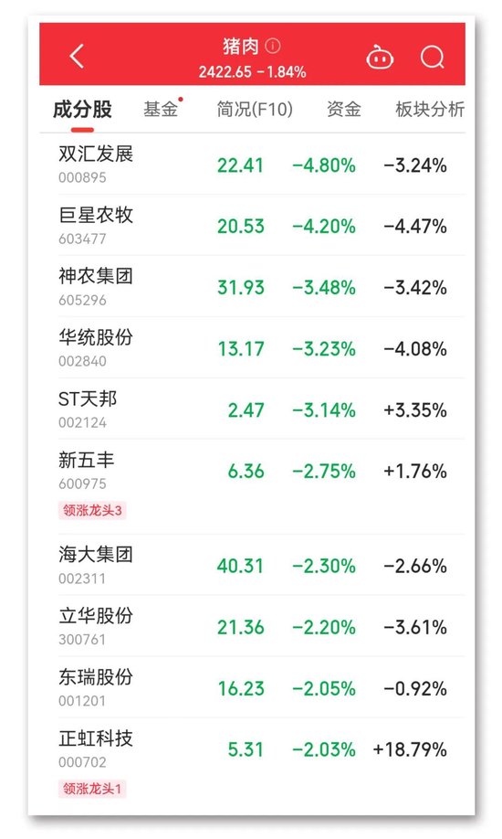 连涨两天后,猪肉板块今天集体走弱。截至收盘,双汇发展、巨星农牧跌超4%,华统股份、神农集团等跌超3%。