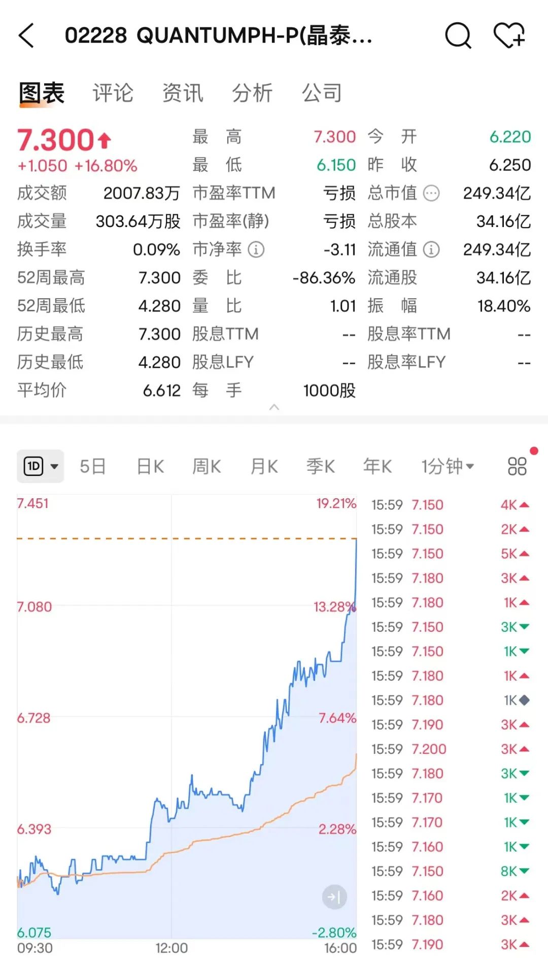 8月14日,港股QUANTUMPH-P(晶泰科技)逆市上涨近17%,报7.3港元,成交2007.83万港元。