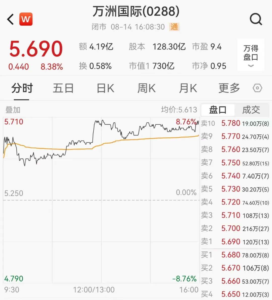 8月14日,全球最大猪肉企业万洲国际涨超8%,报5.69港元,最新总市值为730亿港元。