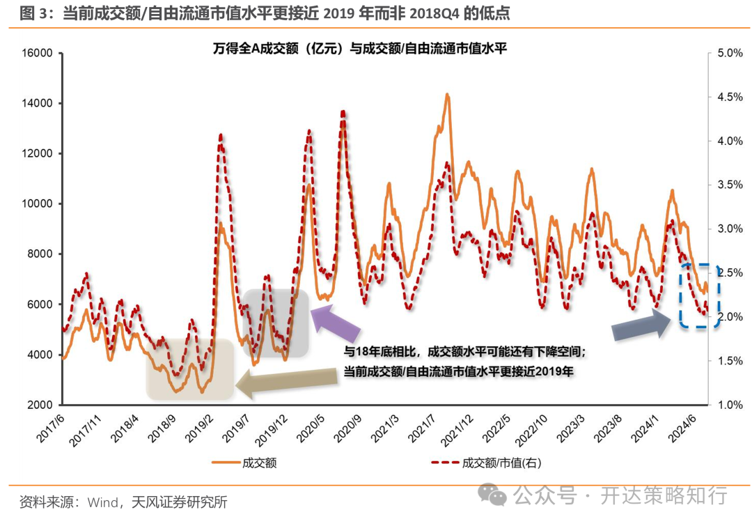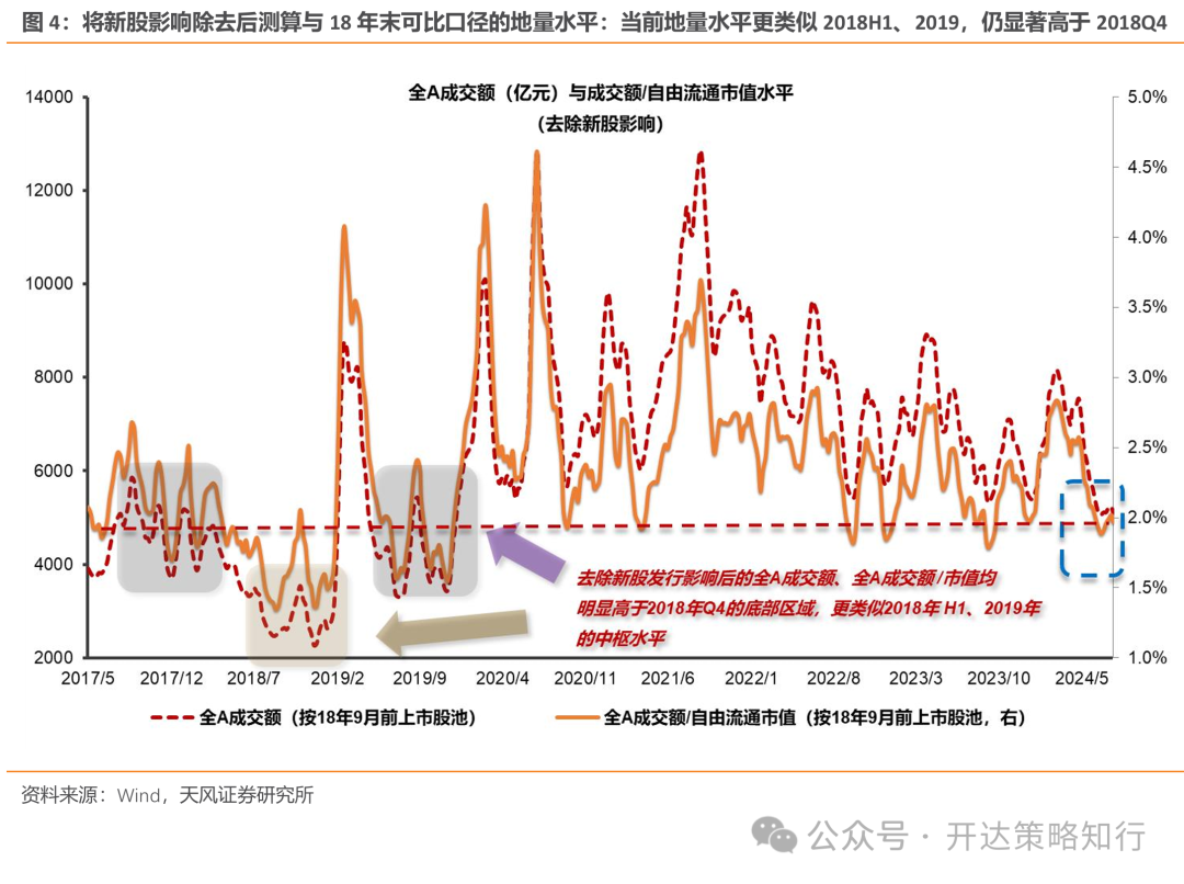 2)地量行情的空间:按可比口径测算,当前A股地量水平大约相当于2018H1、2019的中枢,仍高于2018Q4的低点水平。从实际成交额口径看,当前成交额/自由流通市值水平显著高于2018年Q4的低点(图3)。考虑到2018年后存在大量新股发行,A股扩容后全A股池与2018年可能不可比(我们在《红利落,万物生——风格切换的一些思考》(外发日期:2024/8/2)指出,高市值个股往往对应更高的资金敏感性,即更低的换手率水平),我们去除2018年后发行的新股以可比口径重新测算,发现当前地量水平更类似2018H1、2019,仍显著高于2018Q4(图4)。2024年8月14日,去除新股后的全A成交额为3700亿元,仍远高于2018年Q4地量水平的中枢低点(按20MA测算为2273亿元)。