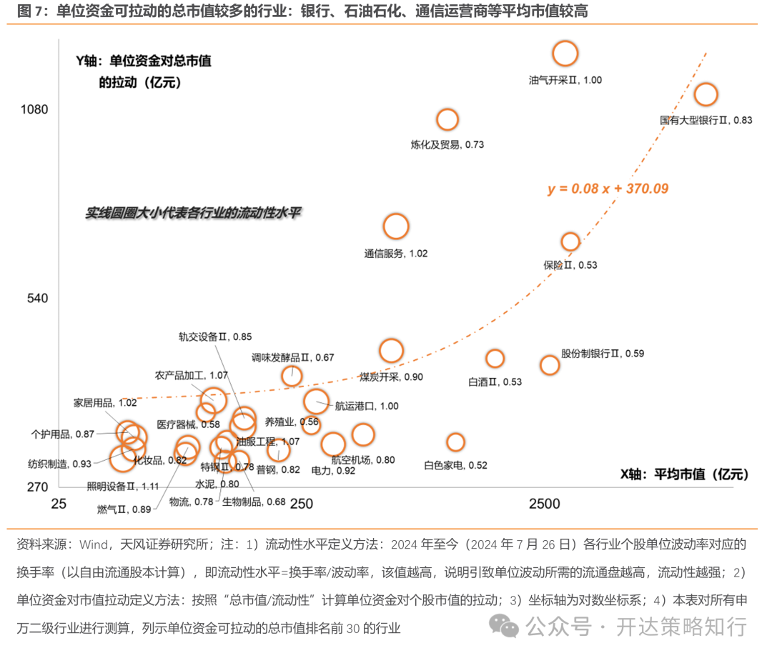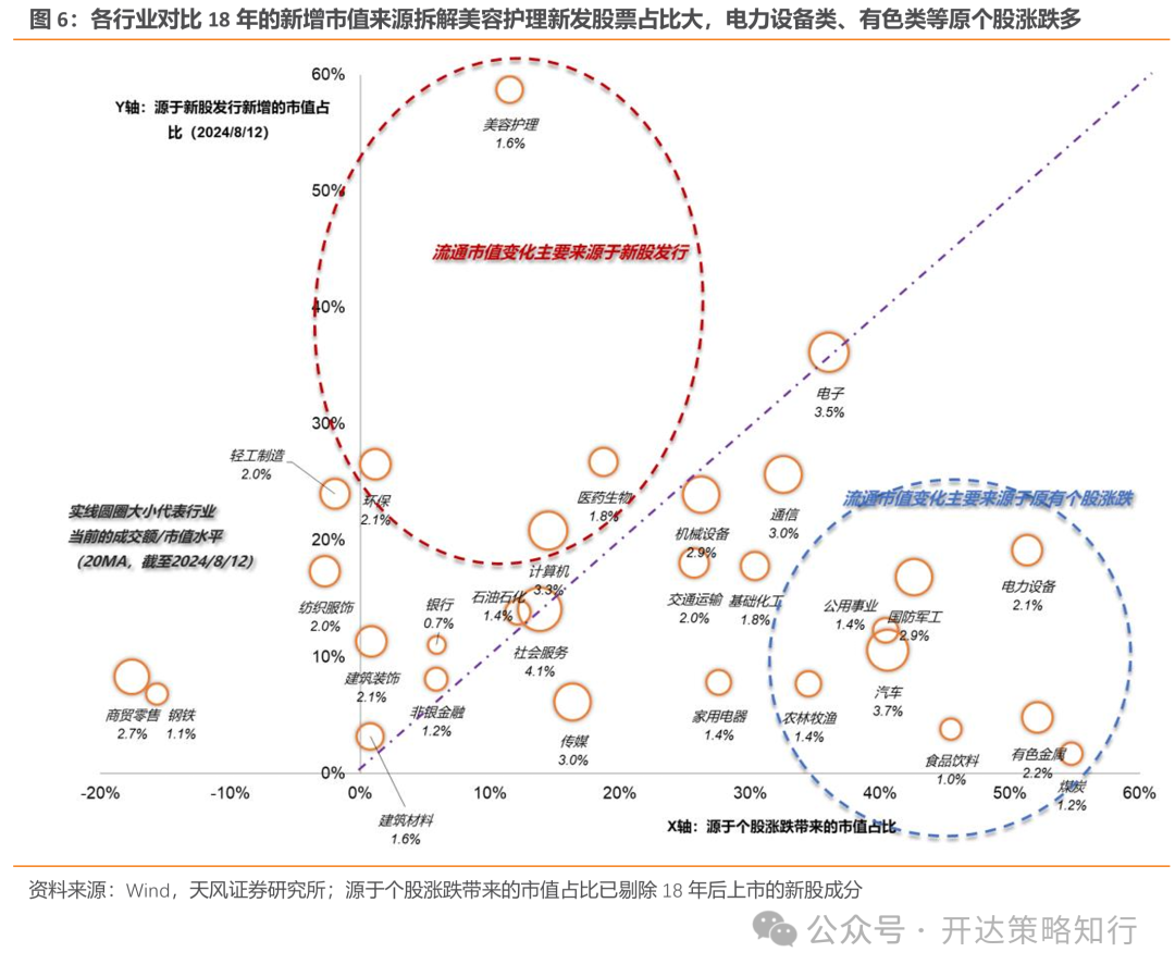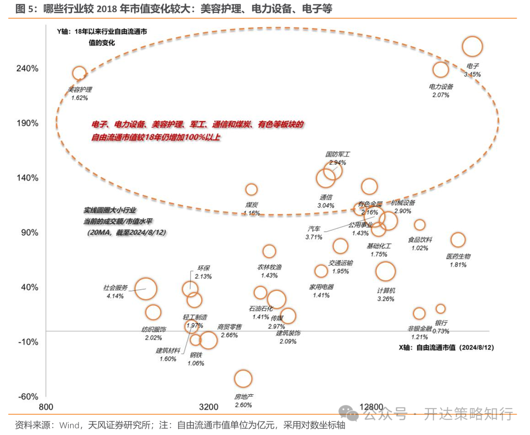 将一个行业跨期作自身类比有两类问题:一是当前与2018年时隔6年,期间部分行业大量新股入池,虽行业名称仍一致,但是当一个行业新加入股票占比超过50%以上,我们很难认为其与2018年可比(如图6的美容护理);二是行业自身有产业生命周期和宏观逻辑变化,例如新能源在2018年-2024年即使除去新股上市影响,原股池也经历了很大的市值成长(图5、图6的电力设备),对应的是行业的快速发展;这类行业在资金行为可能也会发生变化——从偏爱初创、高成长类型的资金逐渐换手至偏爱成熟、大市值风格的资金(这与我们在《红利落,万物生——风格切换的一些思考》(外发日期:2024/8/2)所指出的大市值个股可能资金敏感性更强、换手更低一致,见图7-8),导致行业换手的地量水平也和过往不可比。对于第一类问题,我们测算去除新上市个股的可比行业指数;对于第二类问题,我们按图6拆解结果,对原股池本身市值变化较大的行业进行留意。