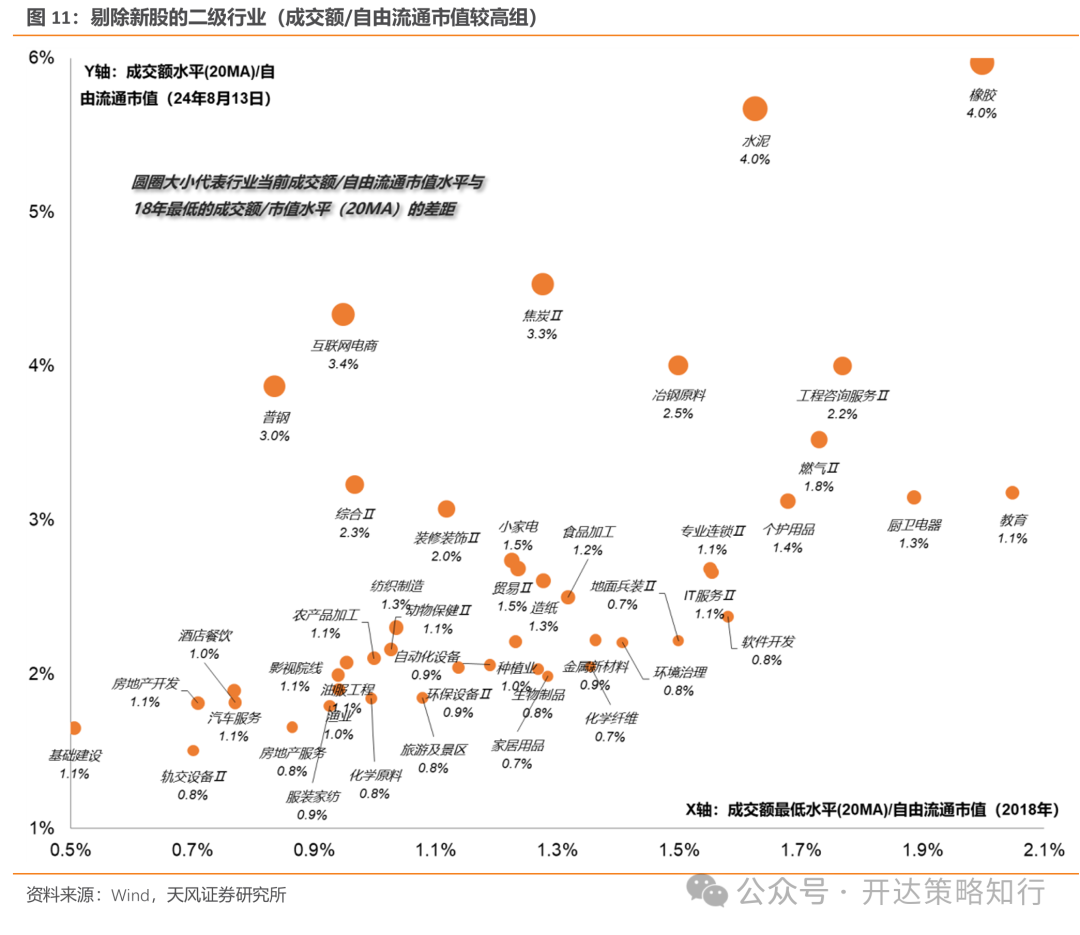 2) 二级行业看,银行、出版、电力、煤炭开采、工业金属等具备一定红利属性的板块和食饮、汽车等消费类板块当前成交额/自由流通市值的水平和18年最低点类似(图10),且绝对水平横向比较也偏低,从量能水平看可能是率先“到位”的方向。