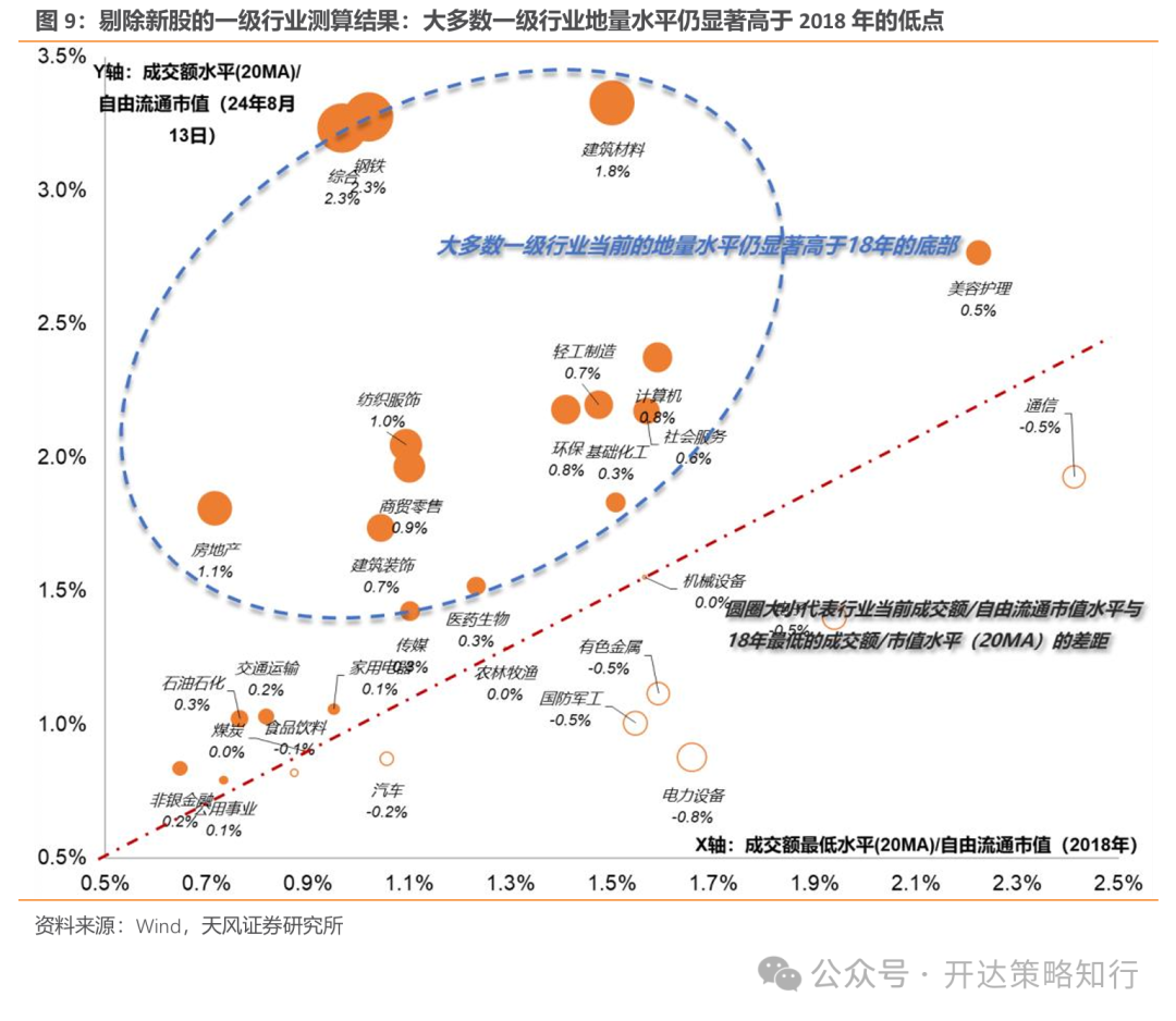 投资启示:1)空间角度看,当前地量水平去除新股影响后,仍显著高于2018年Q4的最低值,大约相当于2018H1、2019的中枢,如以2024/8/14的全A成交额为3700亿元(去除新股后可比口径),仍远高于2018年Q4地量水平的中枢低点(2273亿元);2)时间角度看,2018年下半年的地量行情中,地量后一个月左右现地价,地量行情维持一个季度左右。3)行业结构看,去除新股影响后可比口径下,大多数行业地量水平仍高于18年低点,而银行、出版、电力、煤炭开采、工业金属等具备一定红利属性的板块和食饮、汽车等消费类板块当前地量水平和18年最低点类似,且绝对水平也偏低,从量能水平看可能是率先“到位”的方向。