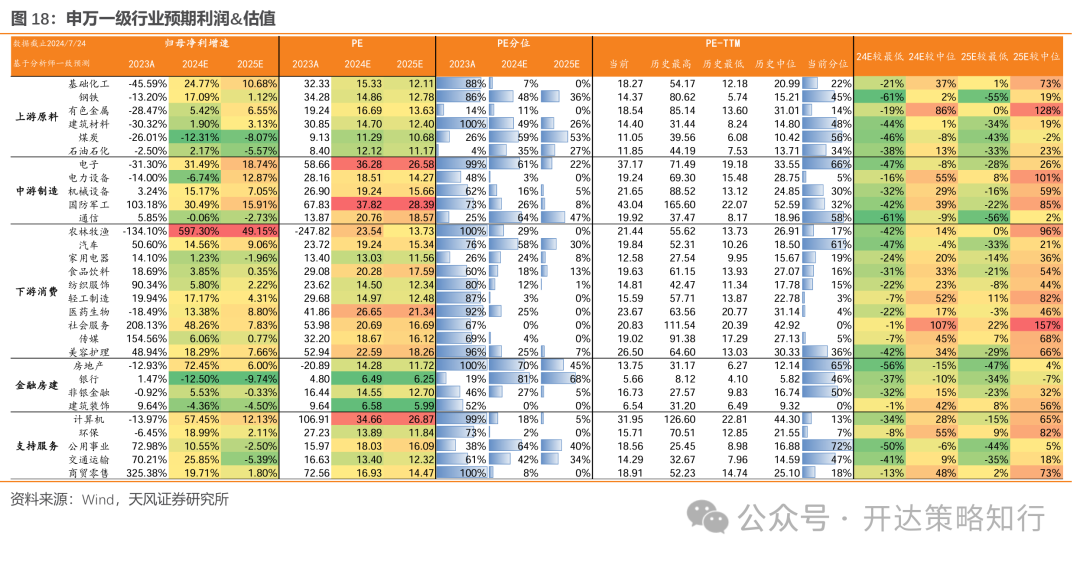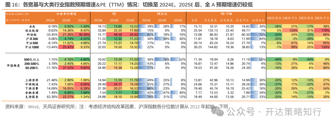 截至2024年7月24日(下同),A股总体PE(TTM)为15.73倍,2012年以来34%分位;创业板指PE(TTM)估值为25.54倍,2012年以来1%分位;从一致预期角度来看,全A总体PE(2024E)为13.85倍,为2012年以来28%分位。